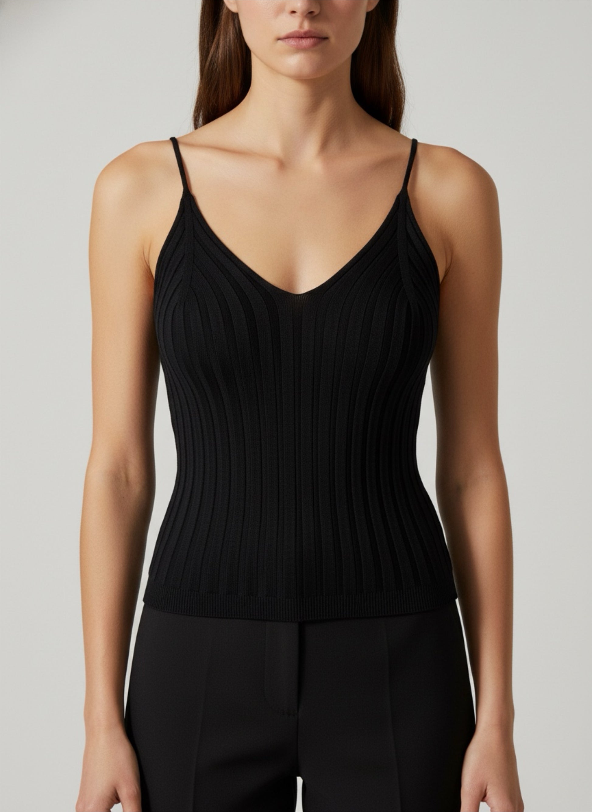 Stricktop tiefer V-Ausschnitt mit Spaghetti Trägern. Gerader Rückausschnitt.
