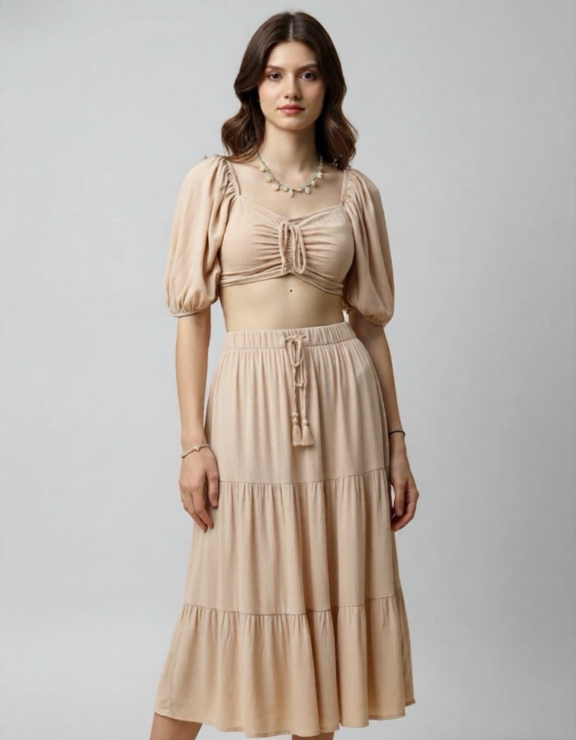 Crop T- Shirt aus leichtem, elastischem Ripp - Jersey mit Kräuselsäumen. Quadratischer- Ausschnitt. Midi Rock elastıschem Bund und verschiedenen Stoffbahnen. Schlitz am Saum.